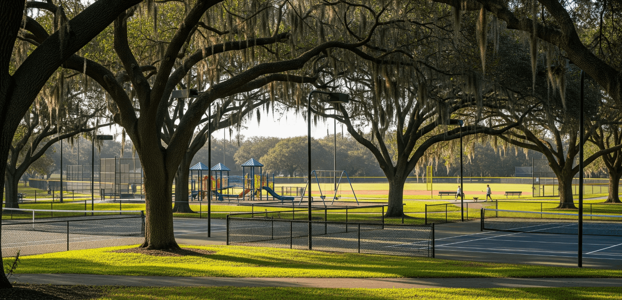 - Walking and jogging under mature oaks.